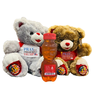 These cuddly Trump Prayer Bears come with a supply of bear food. Trump Honey is nutritions and delicious fresh from the bee hives of South Carolina. And your one of a kind Prayer Bear is made with the best quality materials, this comforttable soft plush stuffed Trump Prayer Bear is customized in the USA.. Get yours today!